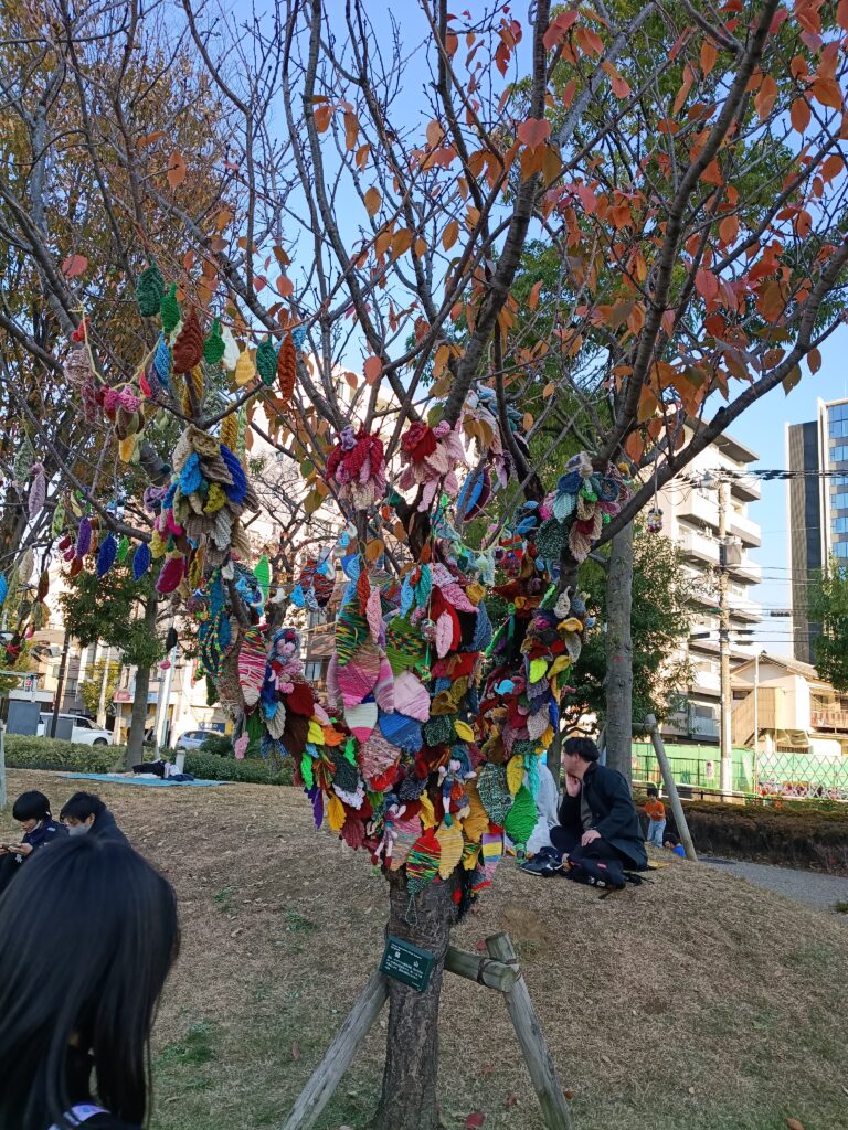 木に葉っぱの編み物を付けています。可愛い見た目ですね。