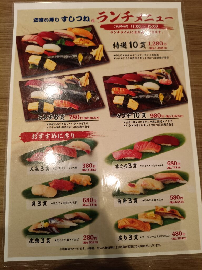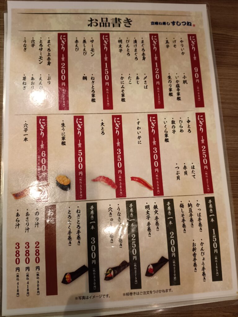 などがあります。それぞれにいいところがあるのですが、すしつねさんは立ち食いでサッと食べられて待つことがあまりない、かつ店内が広いためベビーカーでも入りやすいです。また、接客も気持ちいいためオススメです。