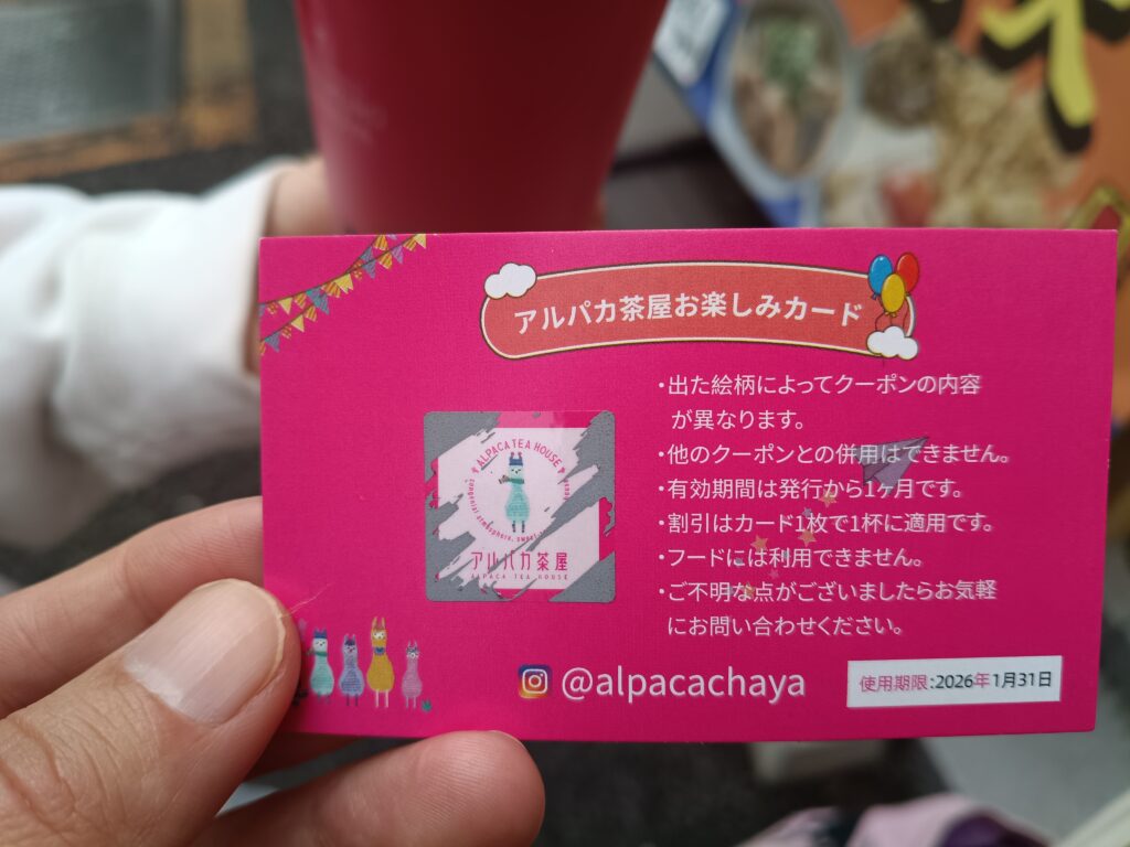 撮影し忘れたのですが、このアルパカは1枚で次回100円引き、何枚か集めていくと更にいい特典があるそうです。
