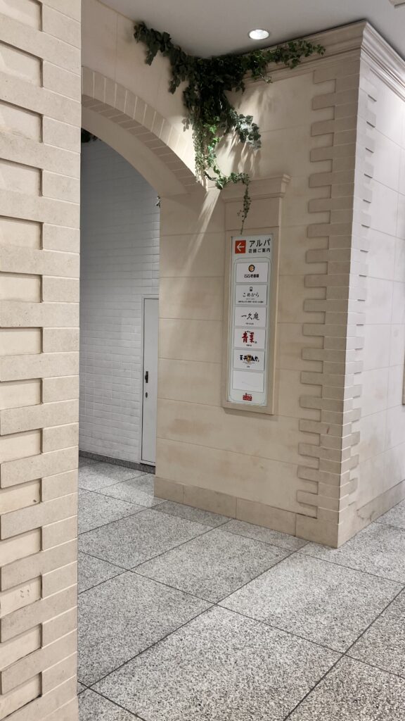ニトリの隣からつながっている地下道を抜け、右側の扉からサンシャインに入ると下記画像のような曲道があるので、ここを左に曲がります。そうすると、、、