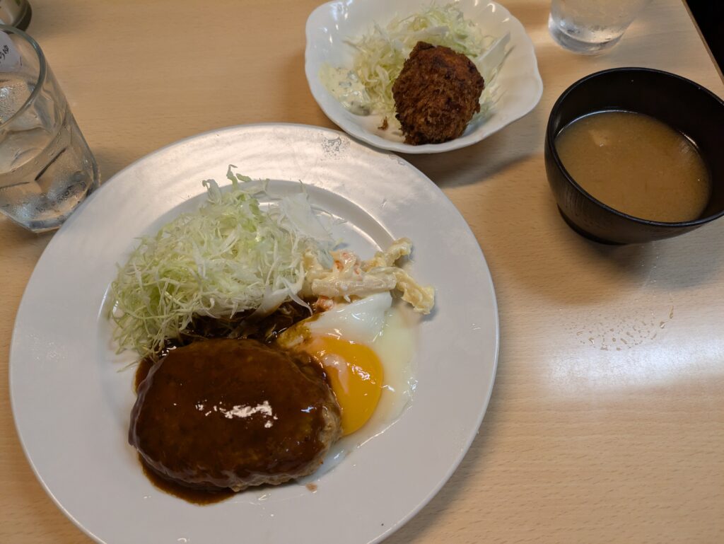 ハンバーグ自体もふっくらとしており、となりに乗ってる目玉焼きと一緒に食べるととってもジューシーでした。