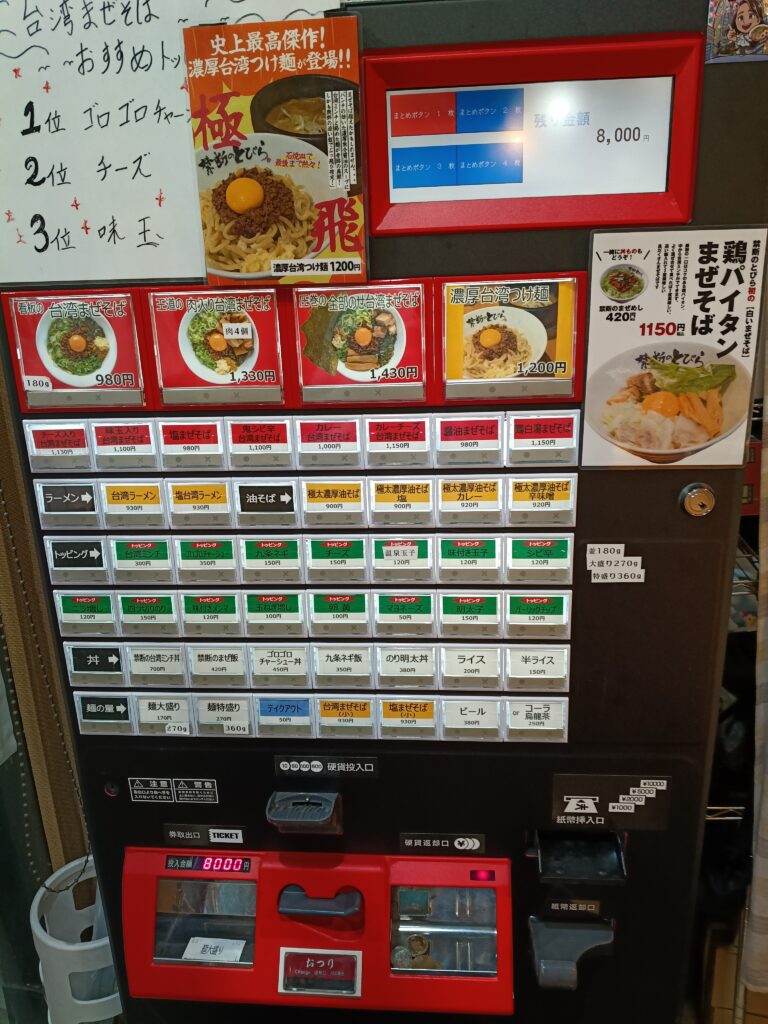 券売機はこちら。初めてきましたが、辛いものが食べたい気分だったので今回は鬼シビ辛台湾まぜそばを注文。大盛りも追加しました。
