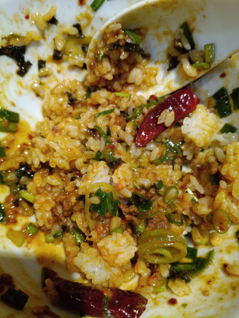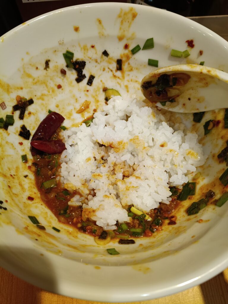 辛さも来ますが、それよりも麺の小麦の味とそれにまとわりつくタレ、ジャンキーなネギなどの美味しさと強めに効いた山椒の方がドッと来ます。美味しいです。
