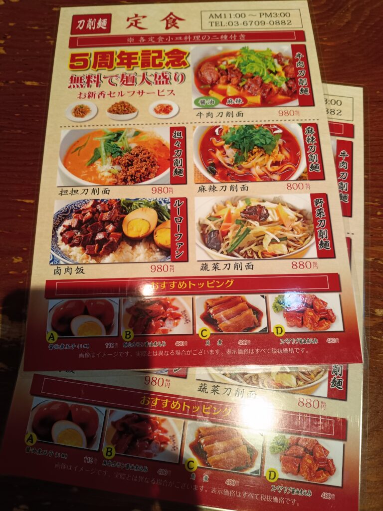 この中から坦々刀削麵を食べました。辛さは通常で麺も大盛りにしました。