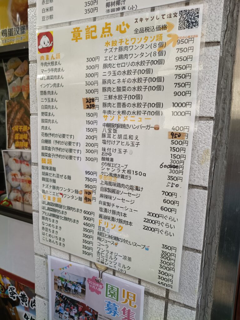 メニューは壁に貼られてありました。今回は肉まんとマーラ牛肉まんを注文。