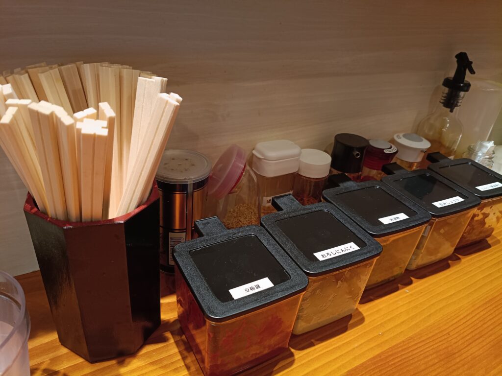 店内の調味料は「豆板醬」「おろしにんにく」「お漬物」「刻みしょうが」「にんにく醬油漬け」など5種類もあって、最後まで飽きさせないで食べれるようになってます。