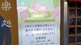 うお継さんの営業日が4月から週3になるらしいです。うお継さんの場所はこちら。 先日、うお継さんにお伺いした際にこんな張り紙が貼られていました。 これは朗報ですね。うお継さんと言えば、コスパ抜群の海鮮や定食をメイ...